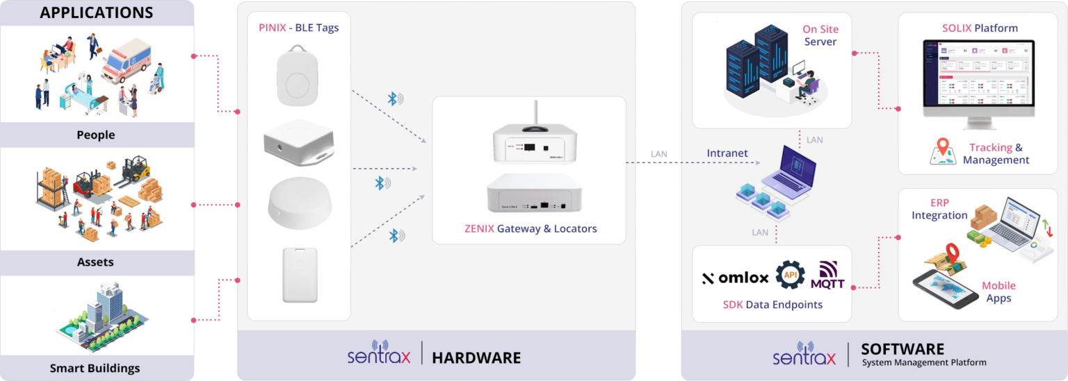 A unified, end-to-end architecture designed for real-time visibility, intelligence, and scale. The Sentrax RTLS ecosystem combines purpose-built hardware with intelligent software and middleware to deliver a single, reliable source of location and operational truth across complex environments